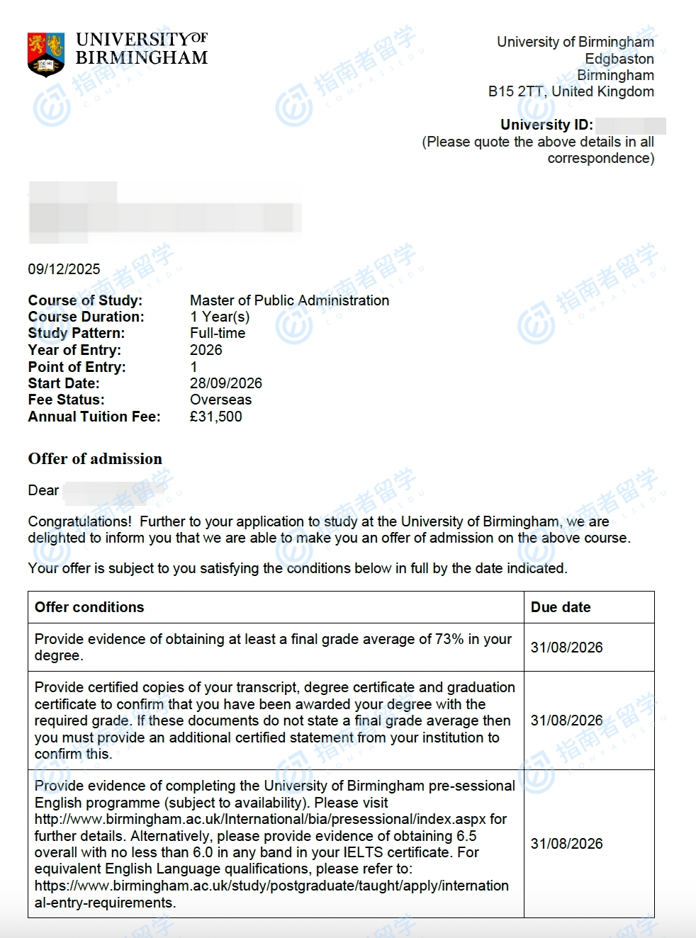 伯明翰大學(xué)公共管理碩士研究生offer一枚