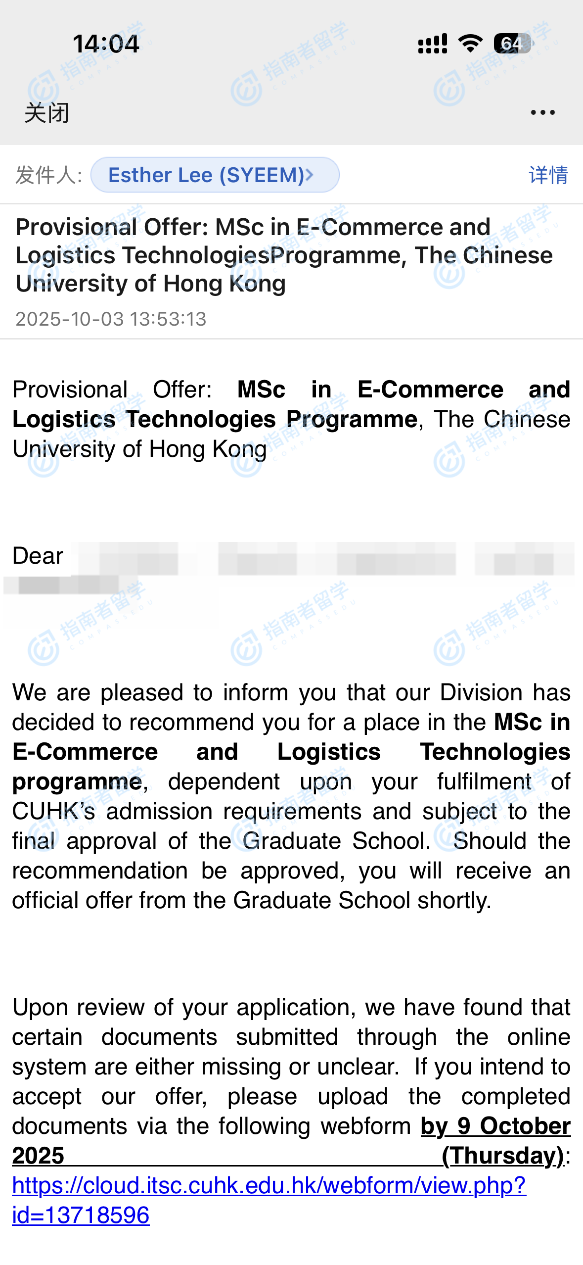 香港中文大學電子商務與物流技術理學碩士研究生offer一枚