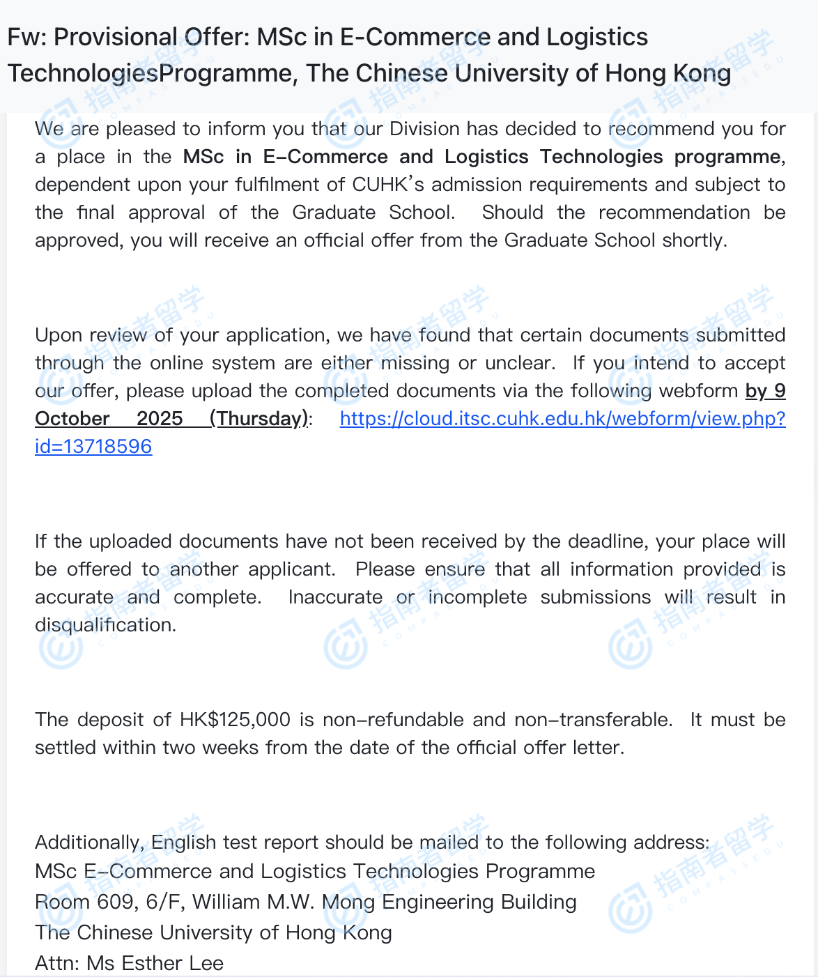 香港中文大學電子商務與物流技術理學碩士研究生offer一枚