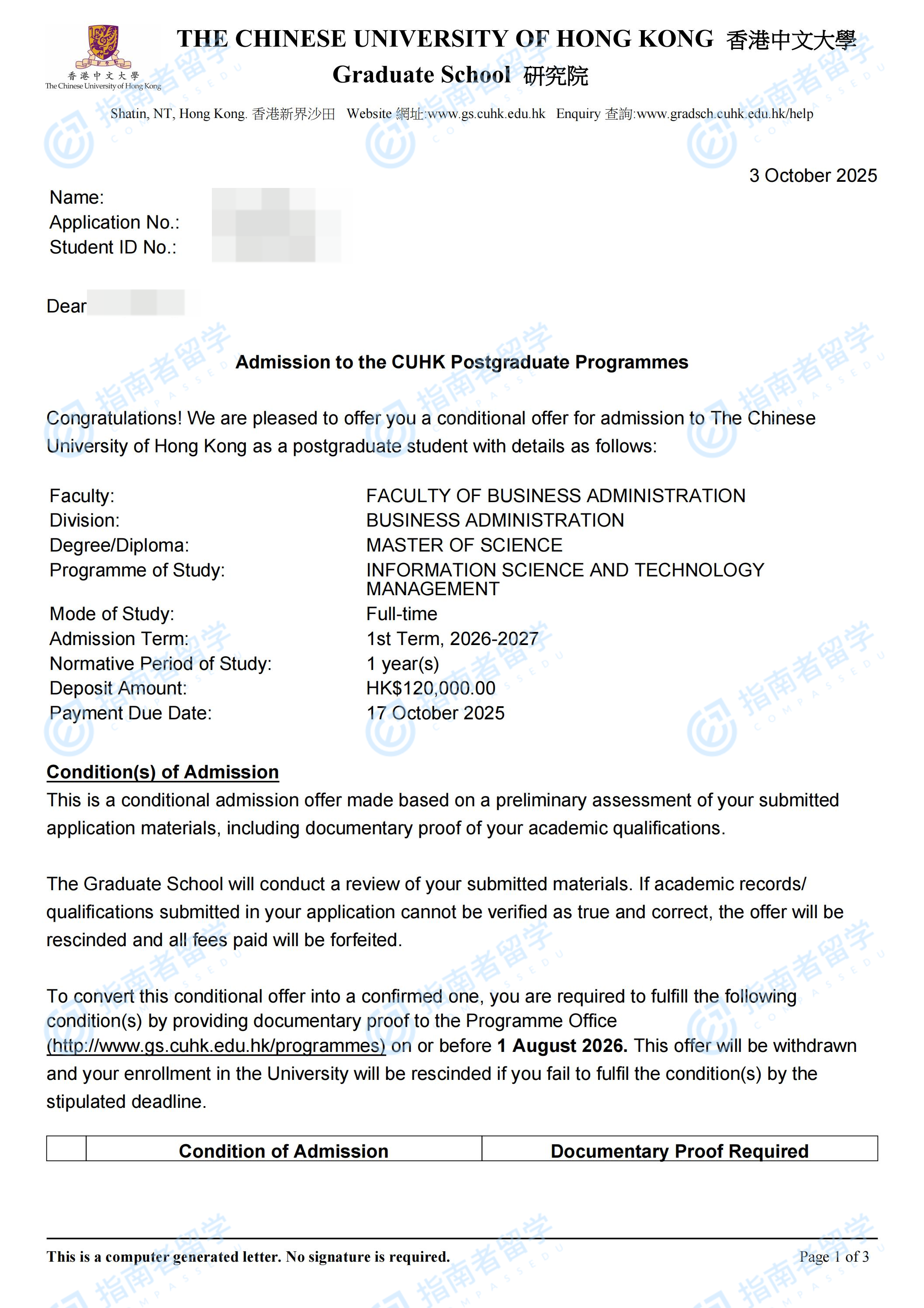香港中文大學(xué)信息科學(xué)與技術(shù)管理理學(xué)碩士研究生offer一枚