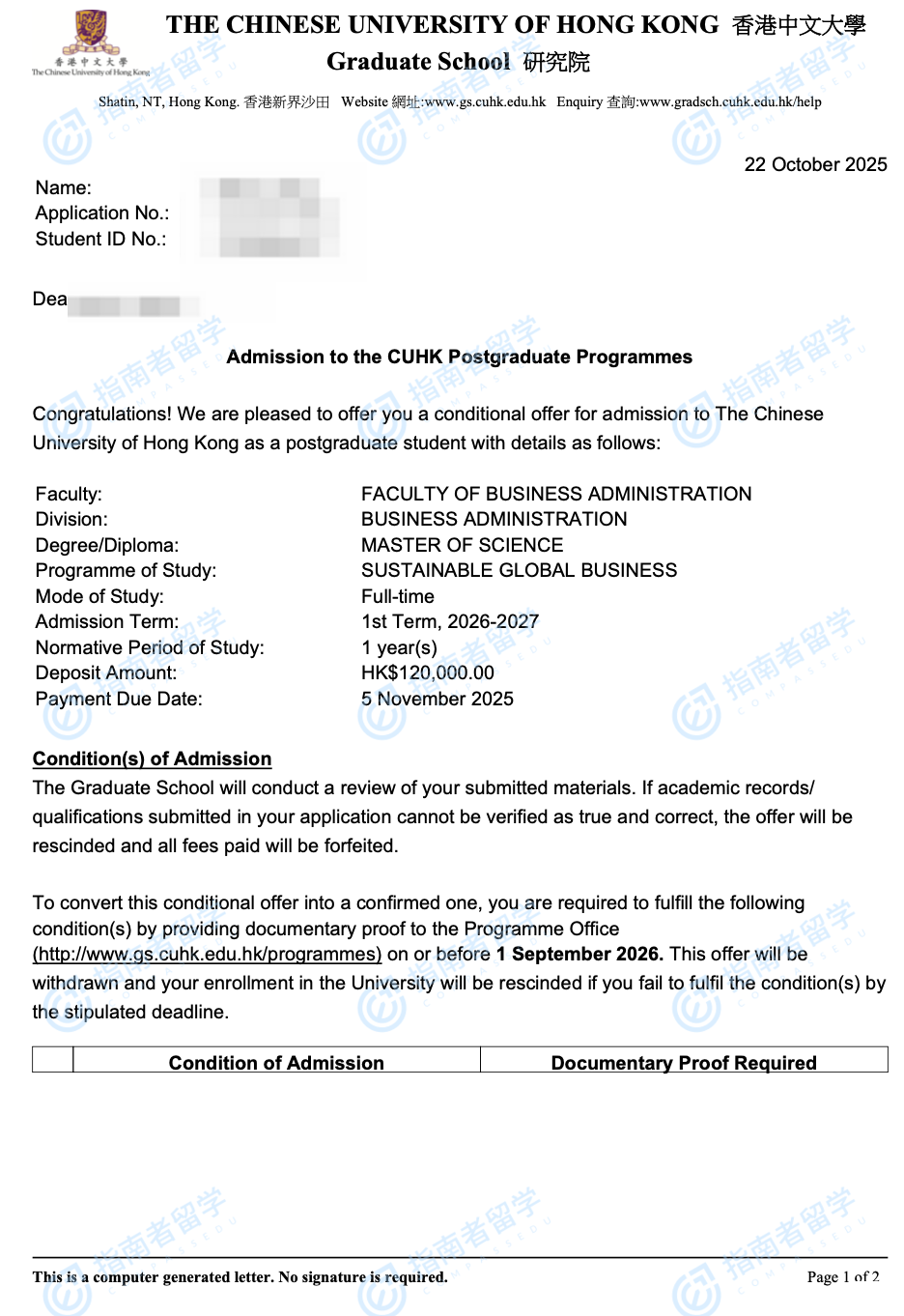 香港中文大學(xué)可持續(xù)環(huán)球商業(yè)理學(xué)碩士研究生offer一枚