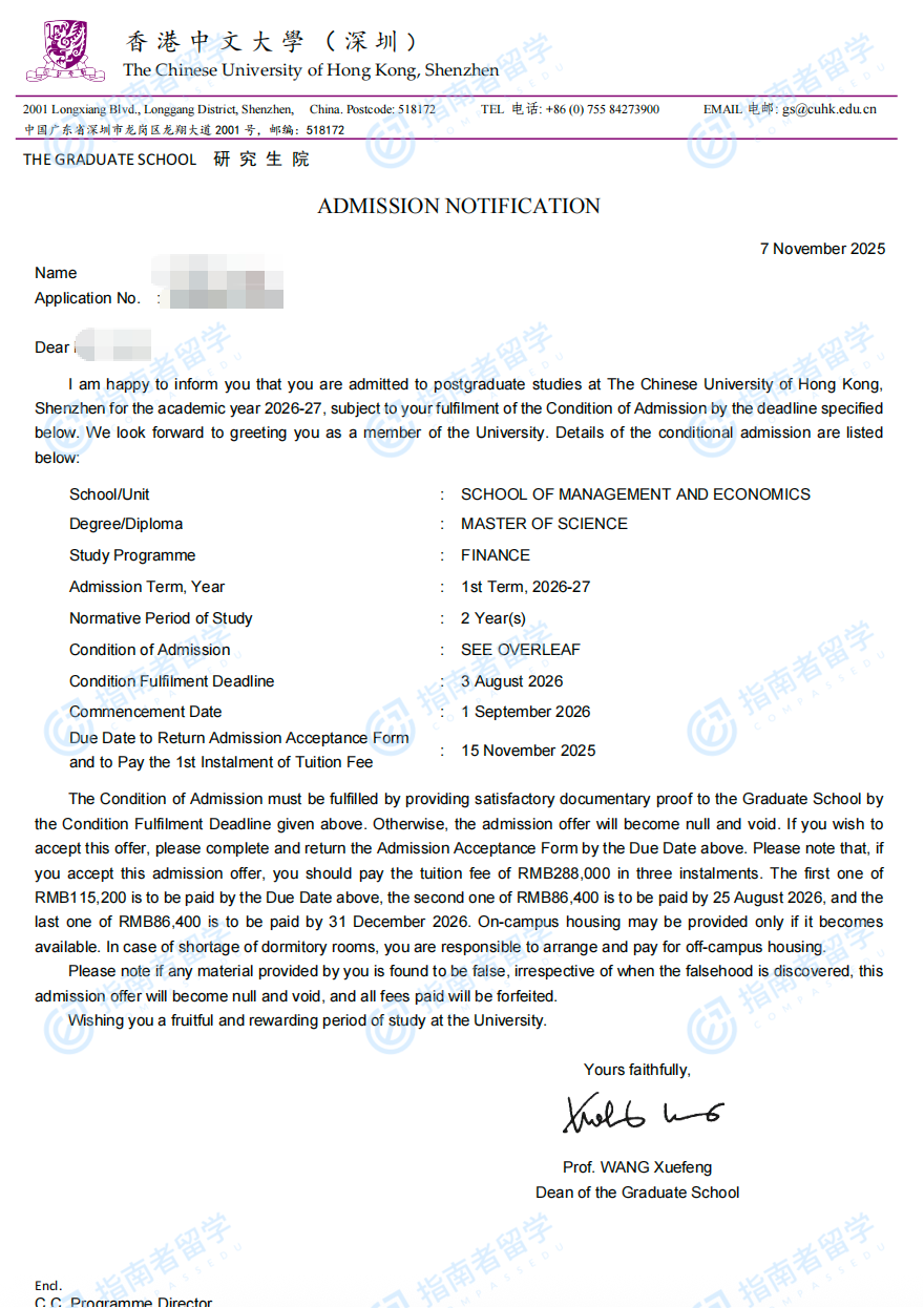 香港中文大學(xué)金融學(xué)理學(xué)碩士(CUHK-Shenzhen)研究生offer一枚