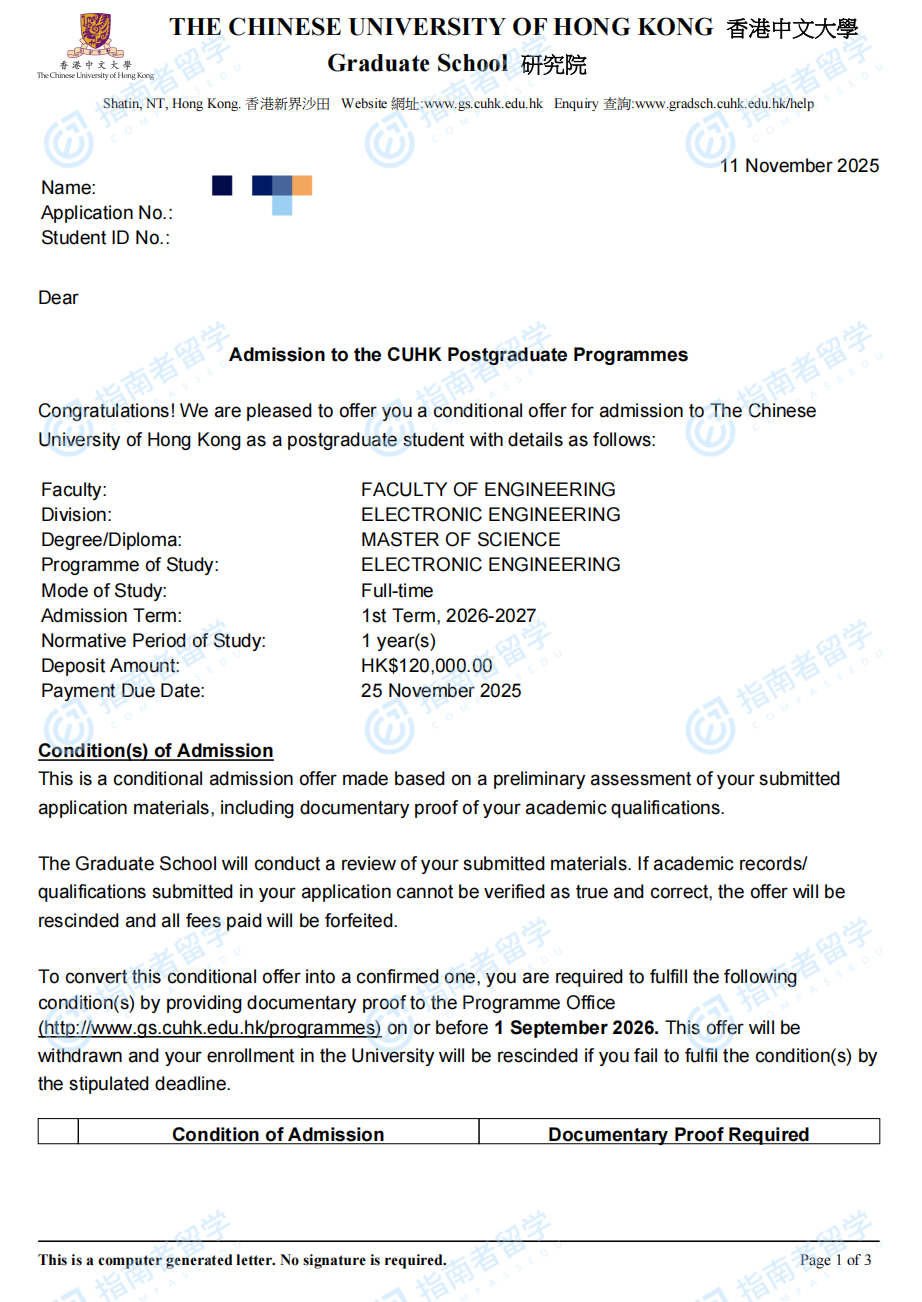 香港中文大學(xué)電子工程理學(xué)碩士研究生offer一枚