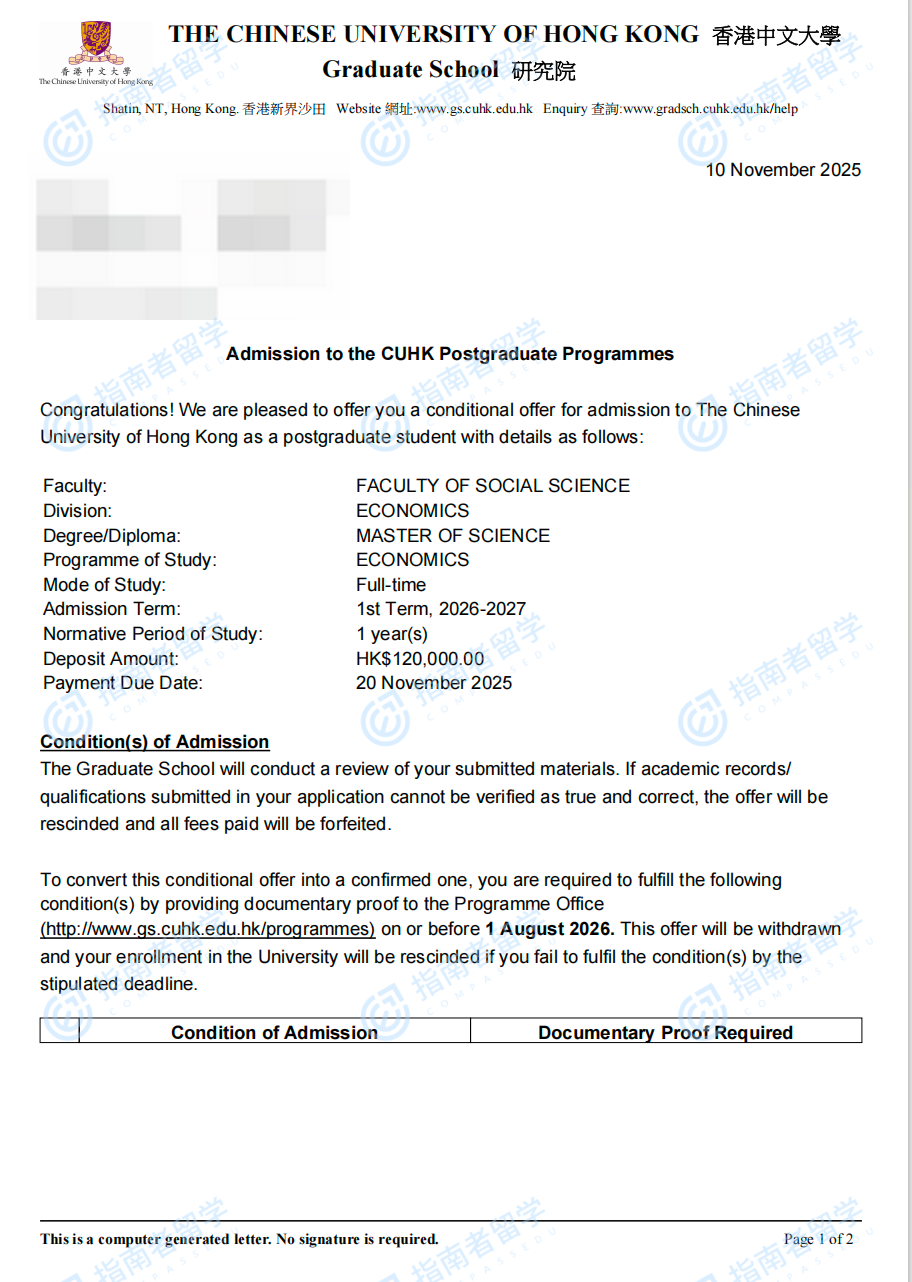 香港中文大學經(jīng)濟學理學碩士研究生offer一枚