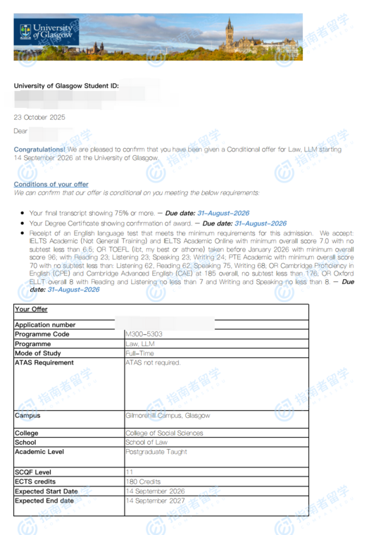 格拉斯哥大學(xué)法學(xué)碩士研究生offer一枚