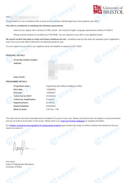 布里斯托大學工程與人工智能理學碩士研究生offer一枚