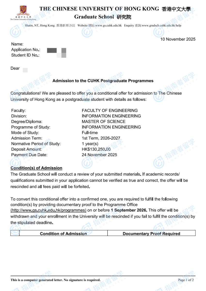 香港中文大學(xué)信息工程理學(xué)碩士研究生offer一枚