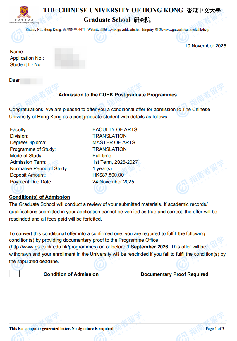 香港中文大學(xué)翻譯學(xué)文學(xué)碩士研究生offer一枚