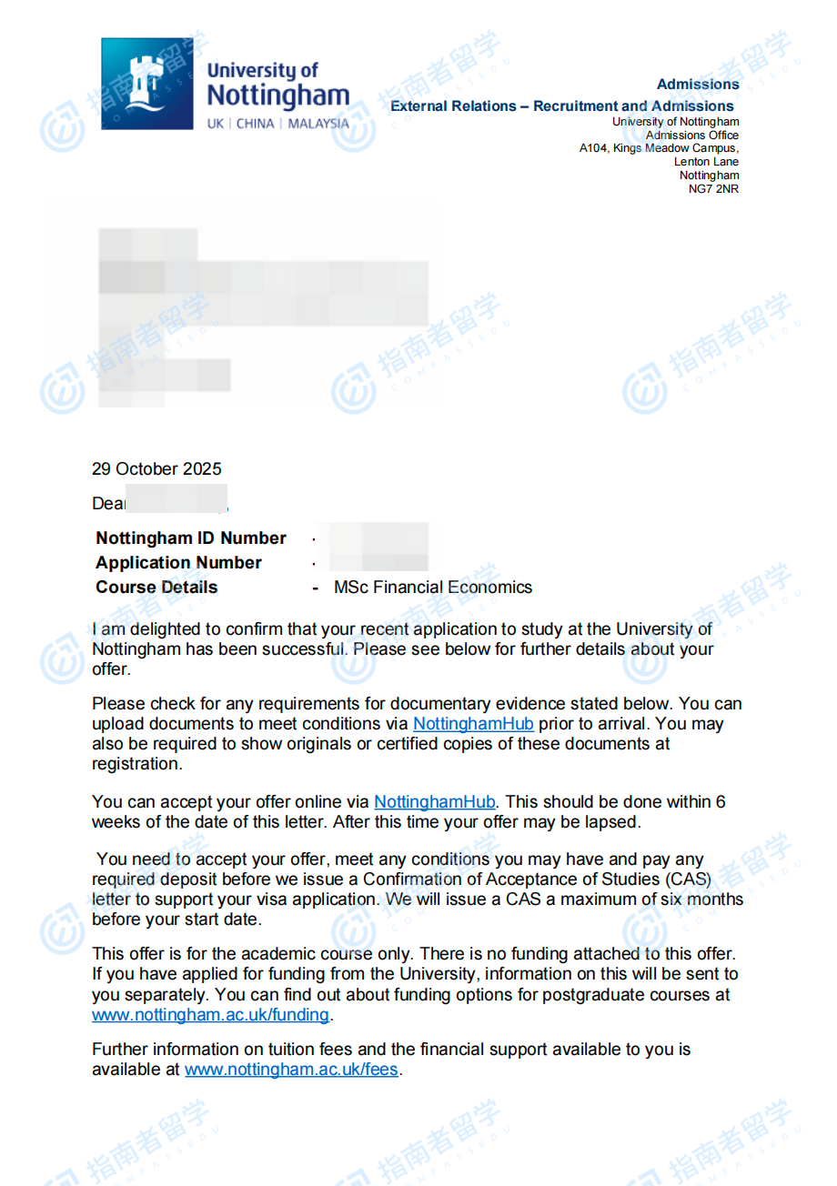 諾丁漢大學(xué)金融經(jīng)濟(jì)學(xué)理學(xué)碩士研究生offer一枚