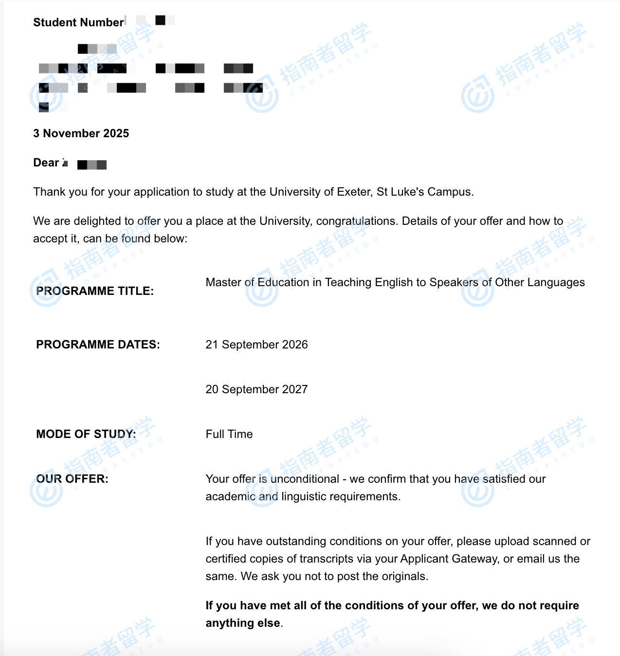 埃克塞特大學(xué)對外英語教學(xué)教育學(xué)碩士研究生offer一枚