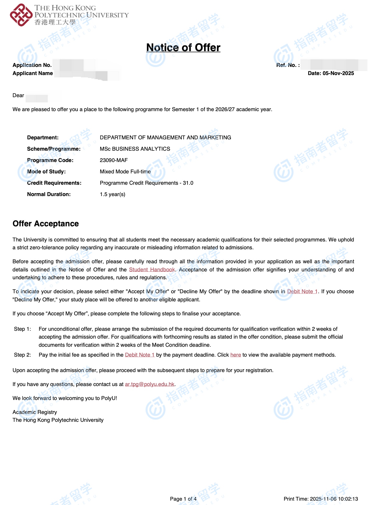 香港理工大學(xué)環(huán)球商業(yè)與決策分析理學(xué)碩士研究生offer一枚