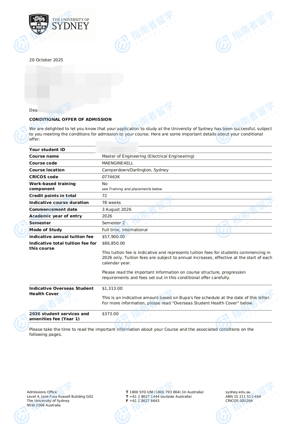 悉尼大學電氣工程工學碩士研究生offer一枚