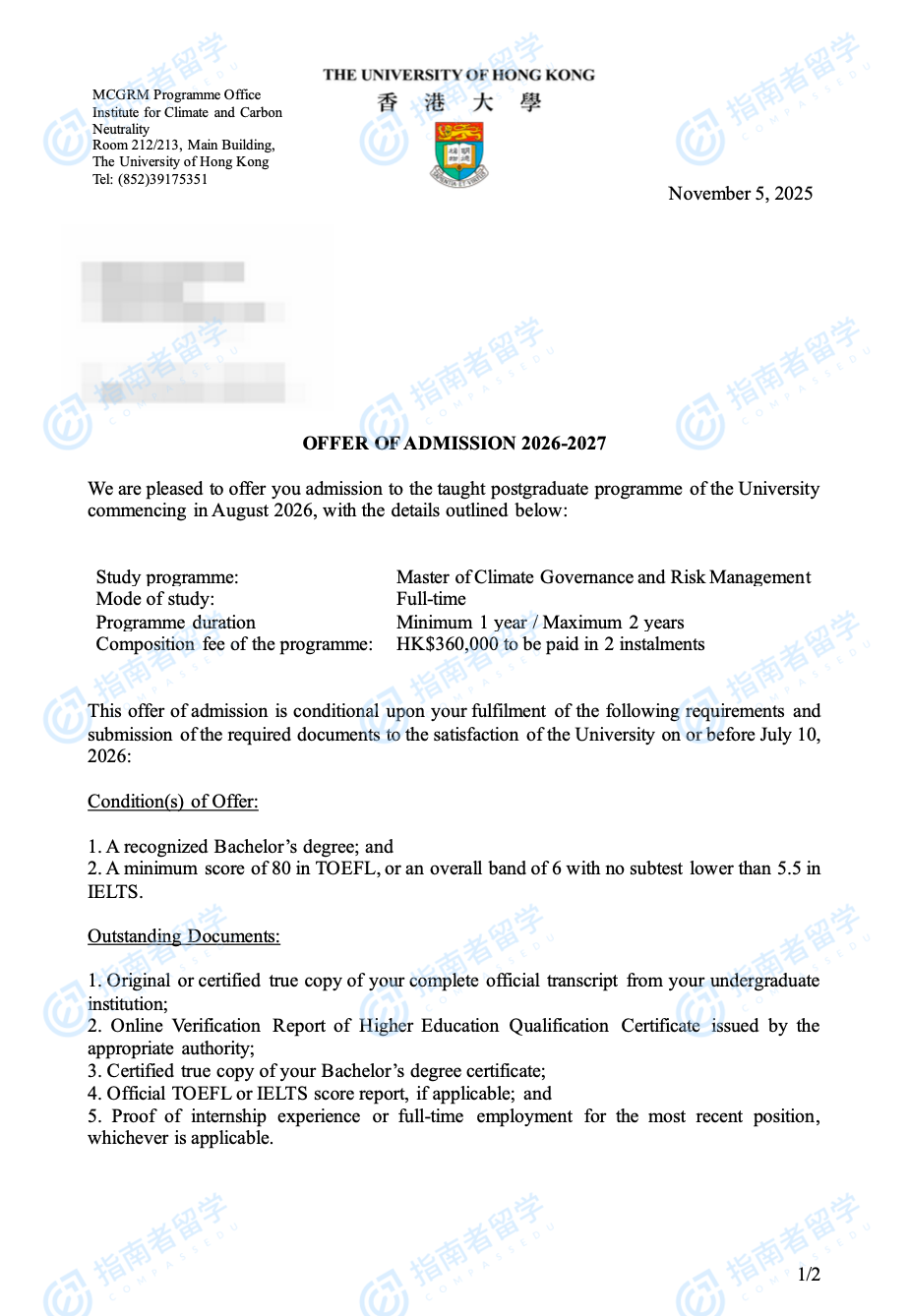 香港大學(xué)氣候治理與風(fēng)險(xiǎn)管理碩士研究生offer一枚