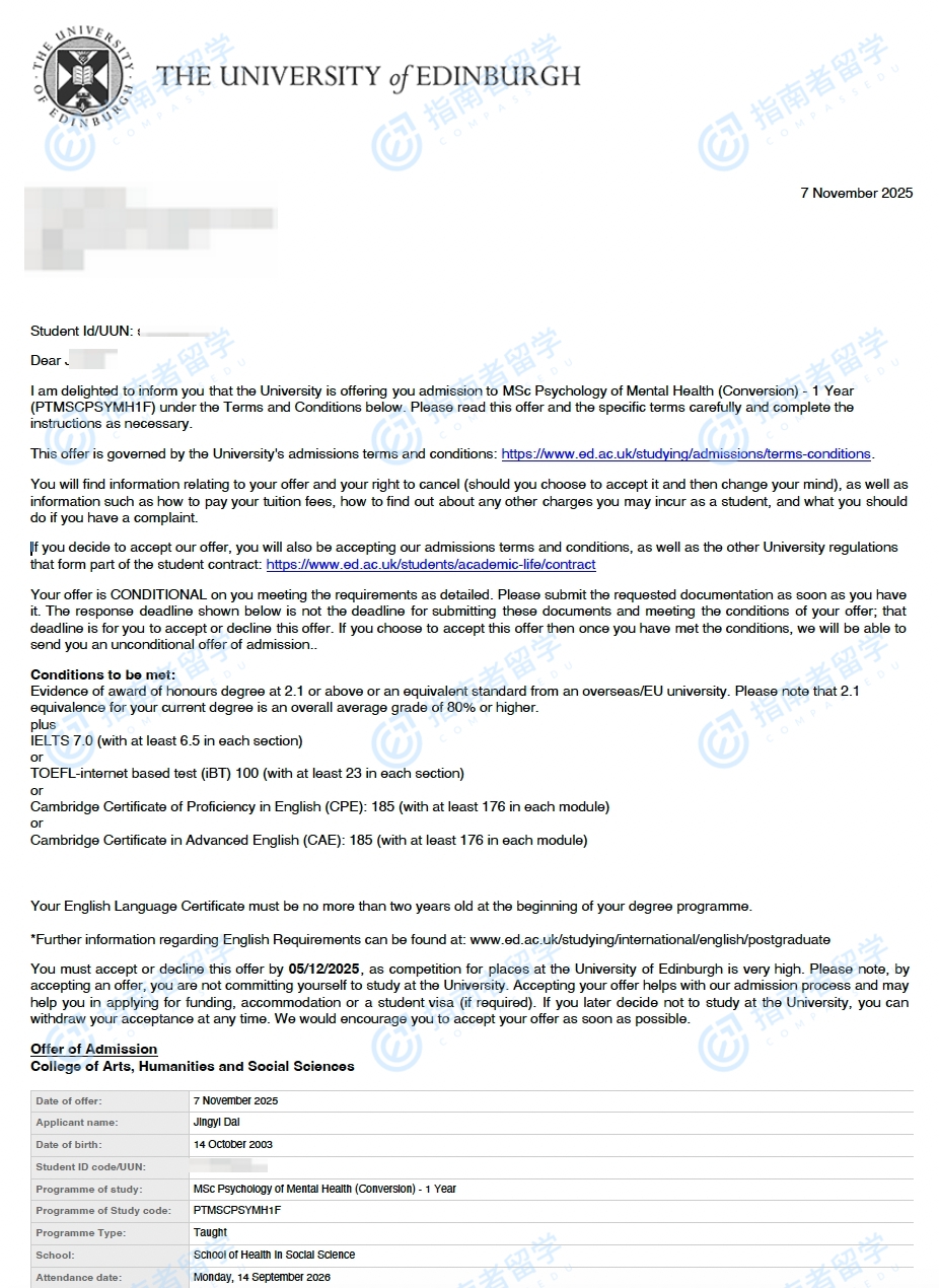 愛(ài)丁堡大學(xué)心理健康心理學(xué)理學(xué)碩士(可跨申)研究生offer一枚