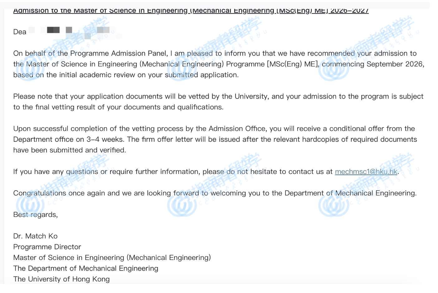 香港大學(xué)機(jī)械工程(工程)理學(xué)碩士研究生offer一枚