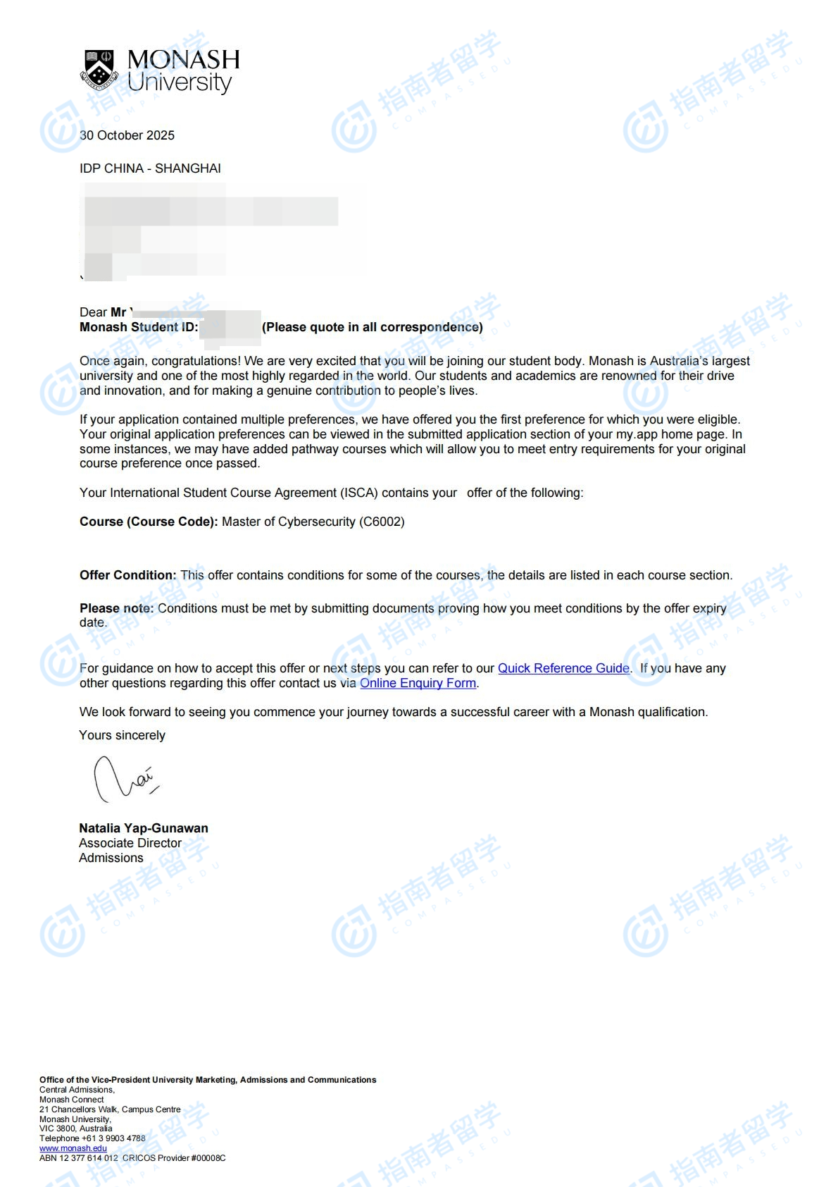 莫納什大學(xué)網(wǎng)絡(luò)安全碩士(1.5年制)研究生offer一枚