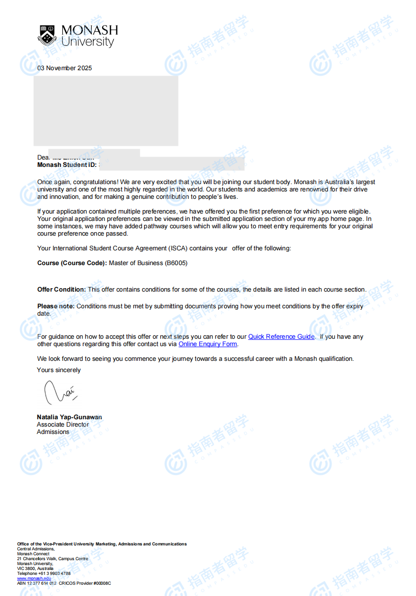莫納什大學(xué)商業(yè)碩士研究生offer一枚