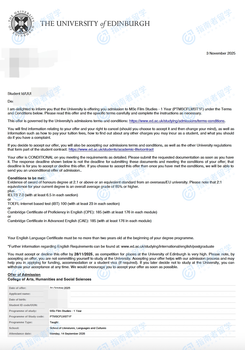 愛丁堡大學(xué)電影研究理學(xué)碩士研究生offer一枚