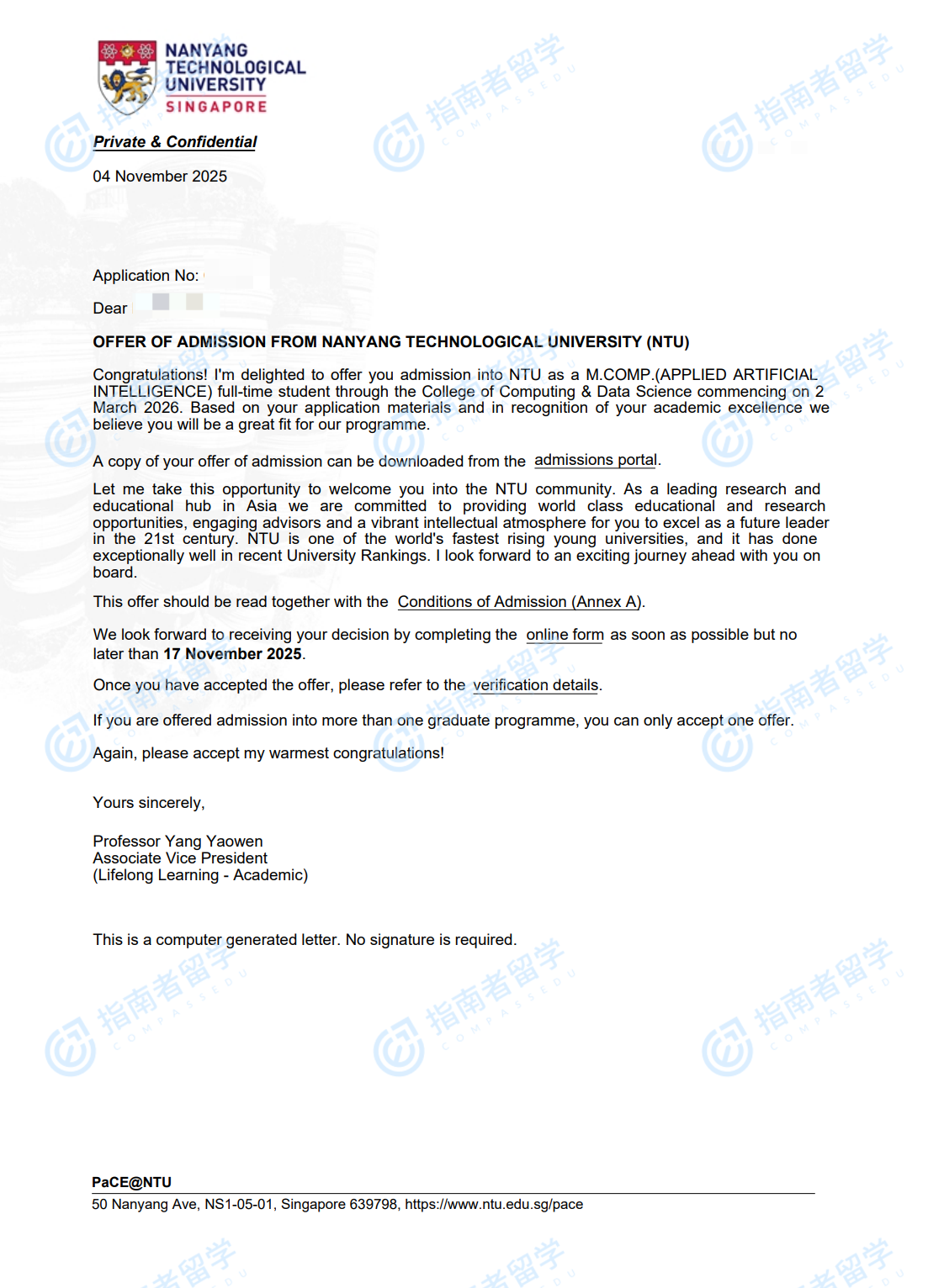 南洋理工大學(xué)應(yīng)用人工智能計算碩士研究生offer一枚