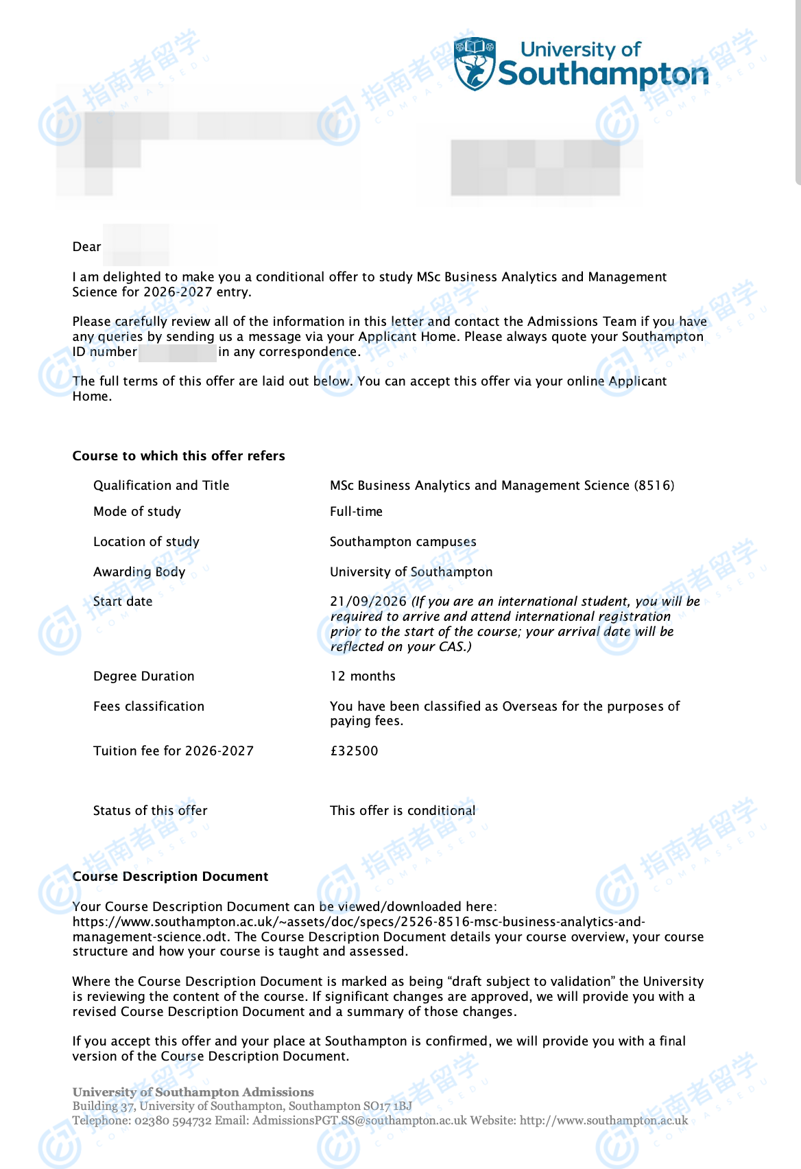 南安普頓大學(xué)商業(yè)分析與管理科學(xué)理學(xué)碩士研究生offer一枚