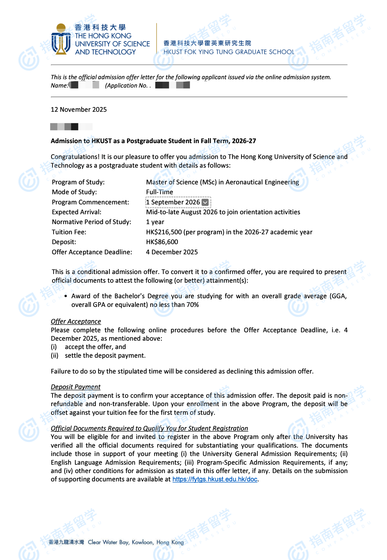 香港科技大學(xué)航空工程理學(xué)碩士研究生offer一枚