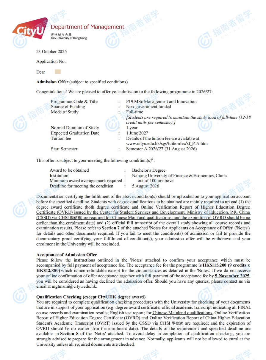香港城市大學(xué)管理與創(chuàng)新理學(xué)碩士研究生offer一枚
