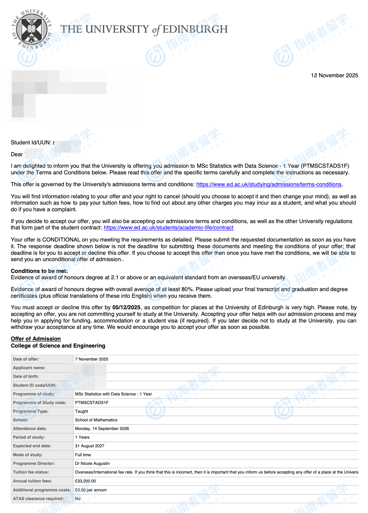 愛丁堡大學統(tǒng)計學與數(shù)據(jù)科學理學碩士研究生offer一枚