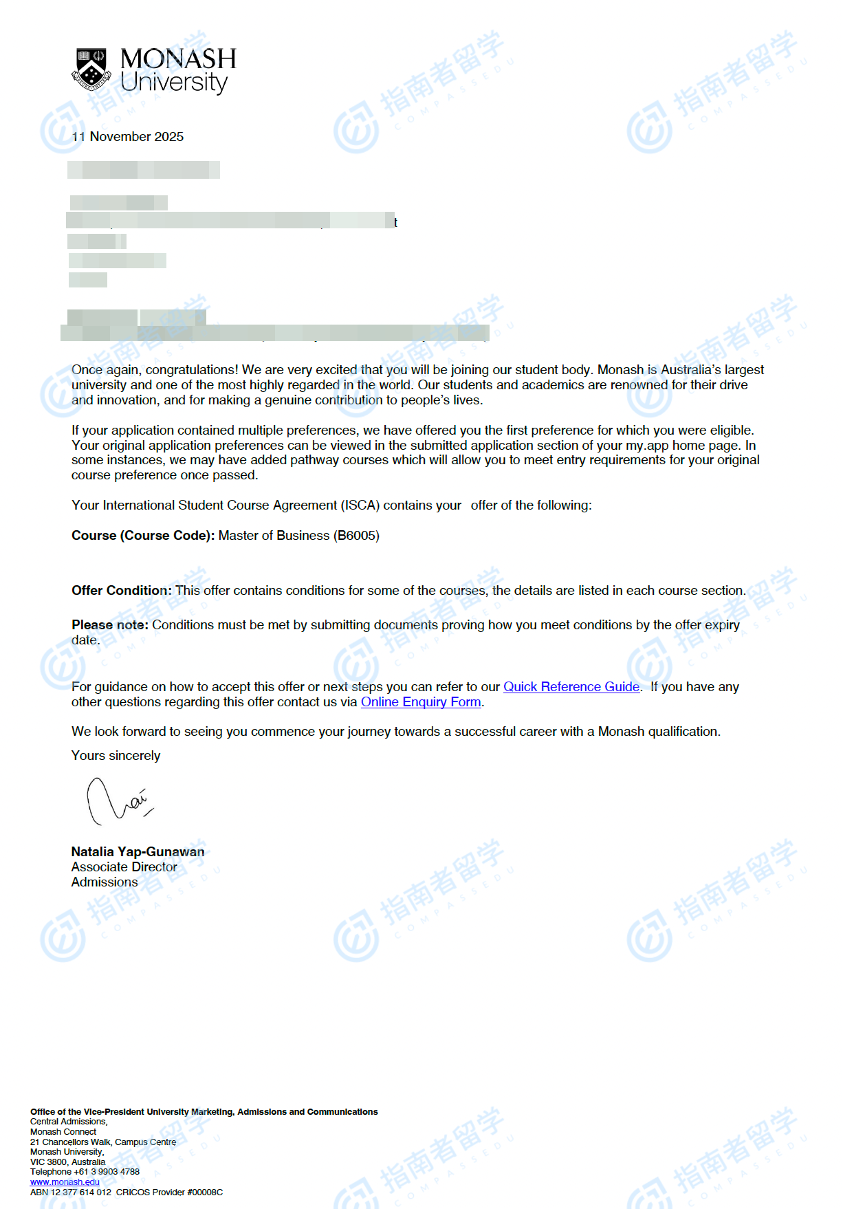 莫納什大學(xué)商業(yè)碩士研究生offer一枚