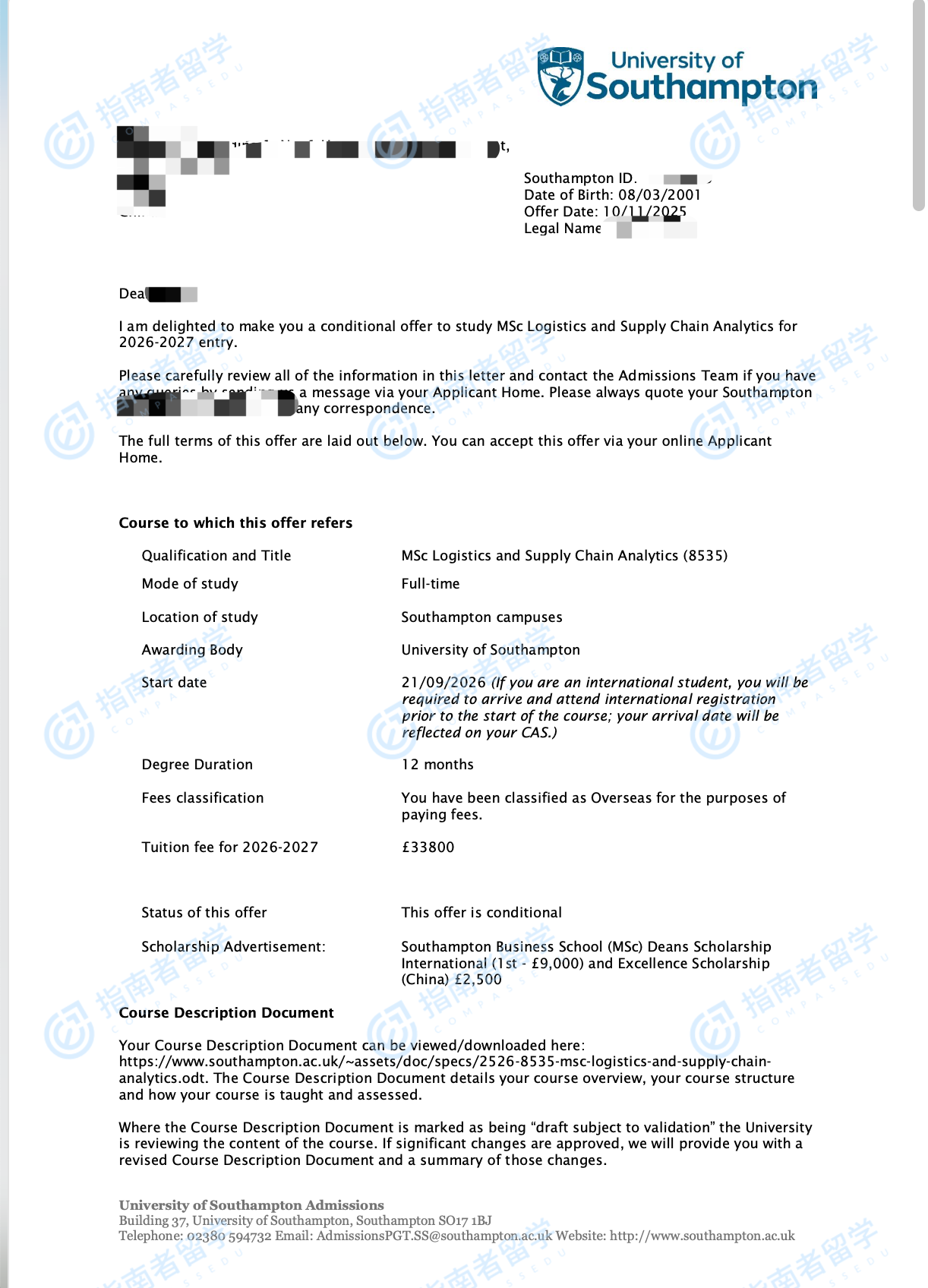 南安普頓大學(xué)物流與供應(yīng)鏈分析理學(xué)碩士研究生offer一枚