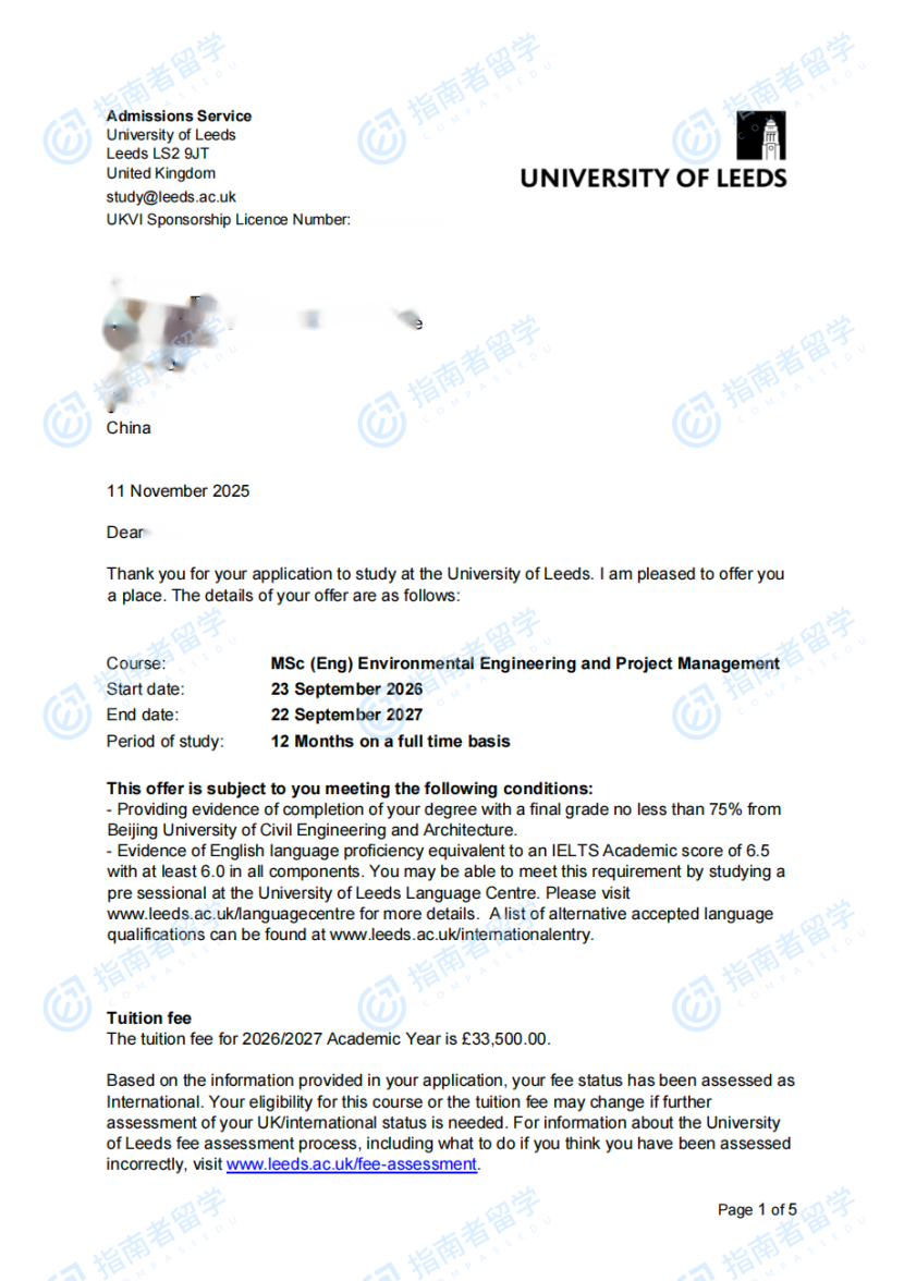 利茲大學(xué)環(huán)境工程與項(xiàng)目管理(工程)理學(xué)碩士研究生offer一枚