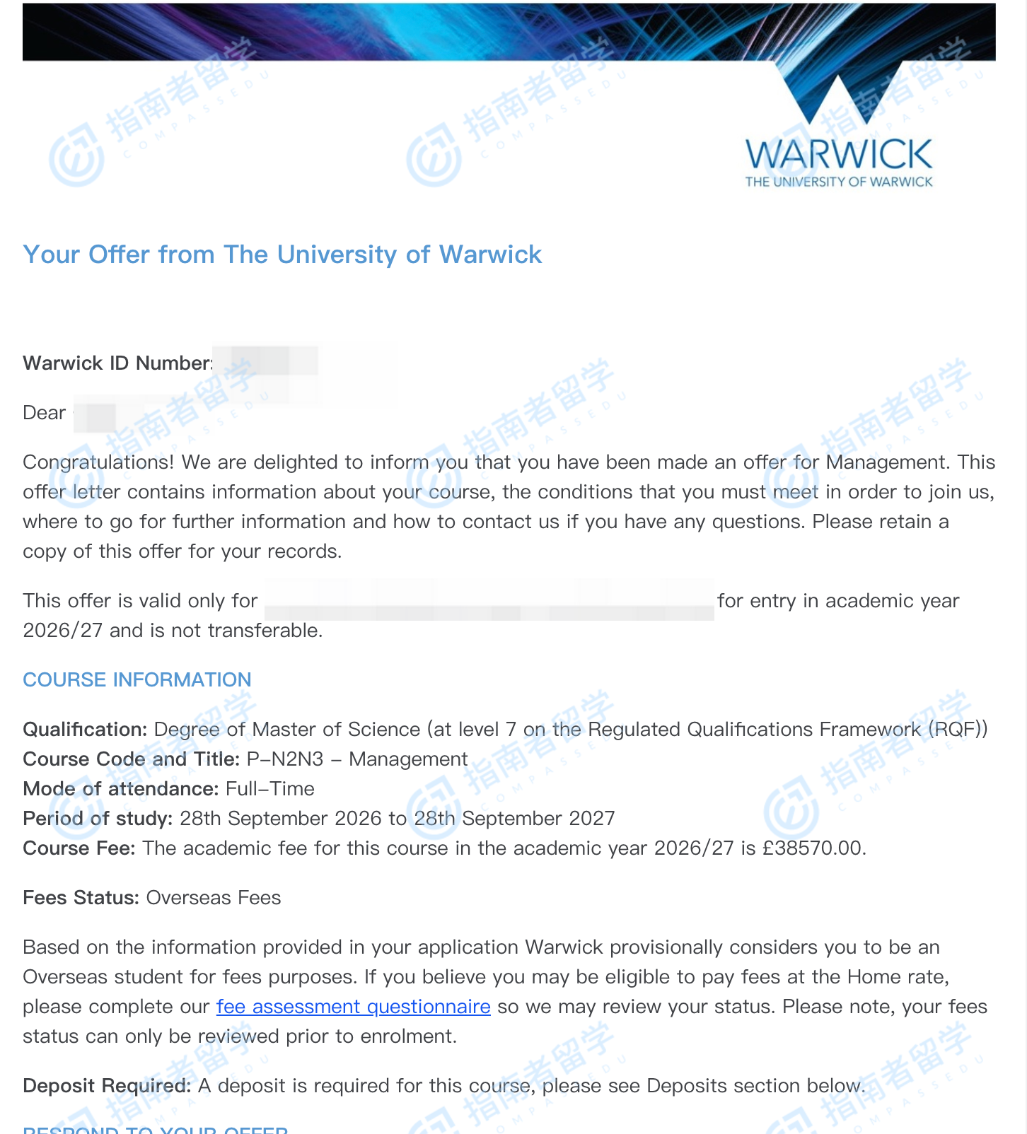 華威大學(xué)管理學(xué)理學(xué)碩士研究生offer一枚