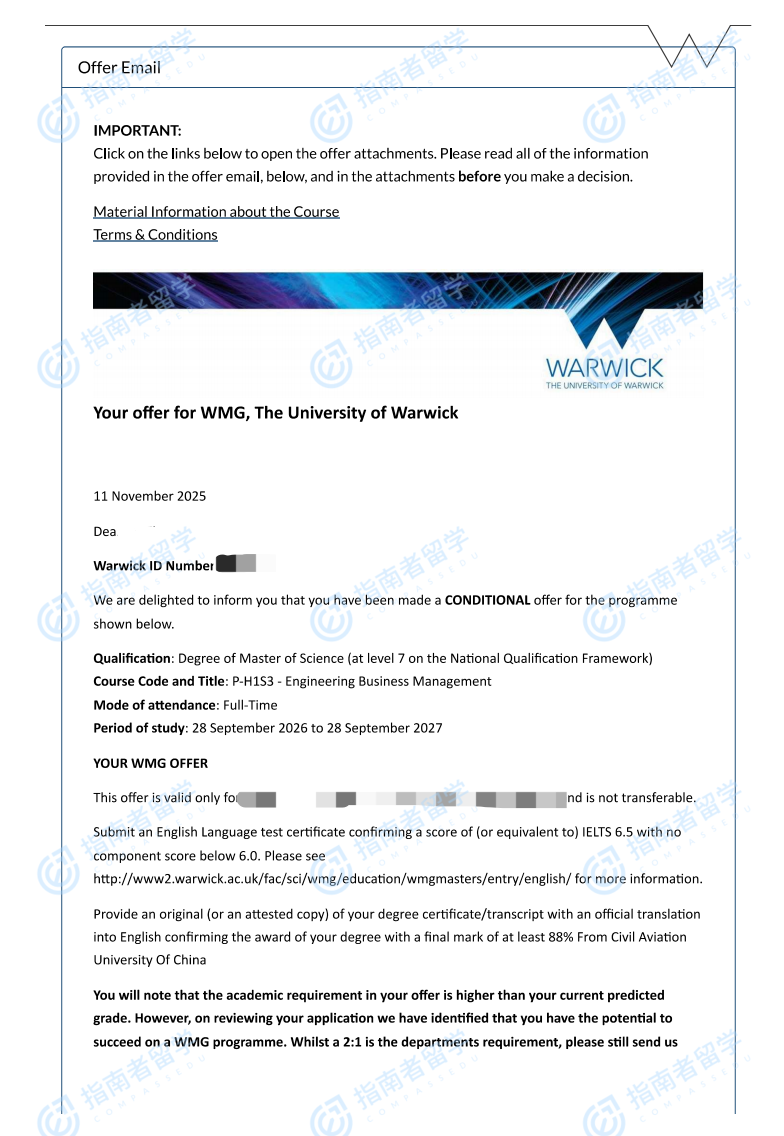華威大學(xué)工程商務(wù)管理理學(xué)碩士研究生offer一枚