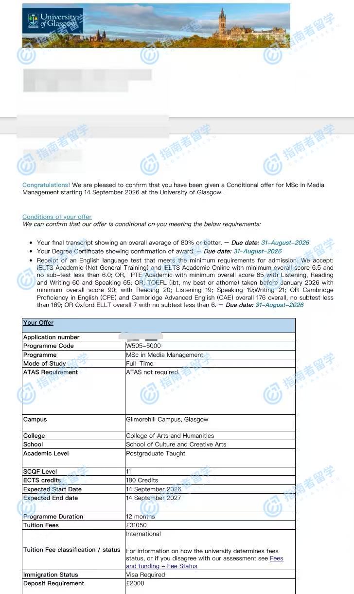 格拉斯哥大學(xué)媒體管理理學(xué)碩士研究生offer一枚