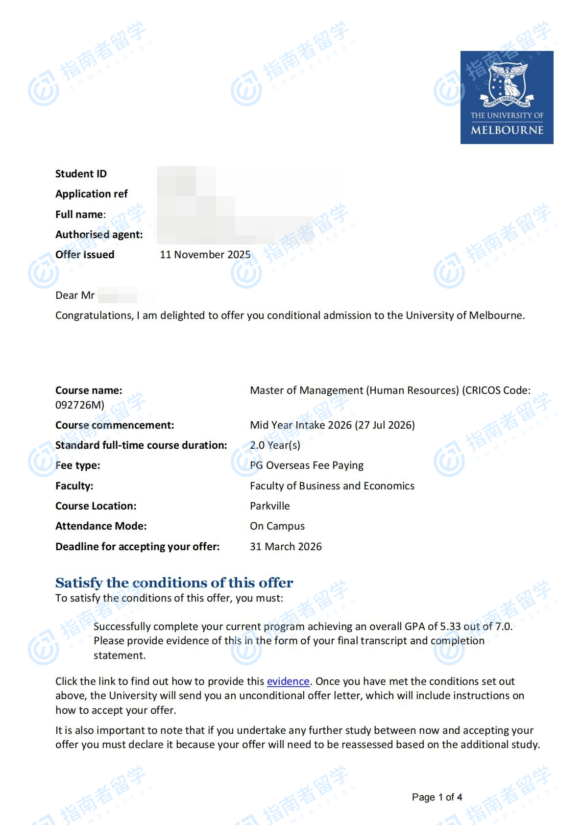 墨爾本大學(xué)管理學(xué)碩士(人力資源)研究生offer一枚
