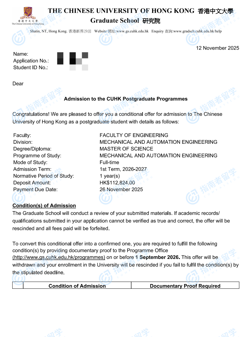 香港中文大學(xué)機械與自動化工程理學(xué)碩士研究生offer一枚