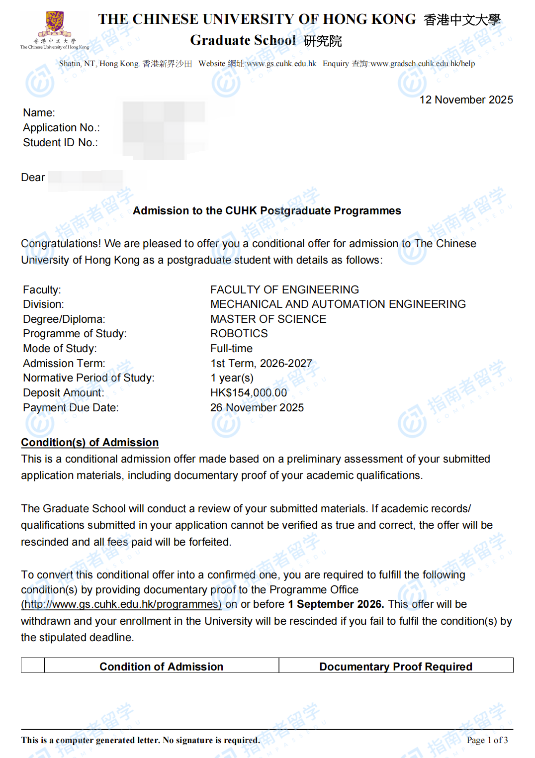 香港中文大學(xué)機(jī)械與自動(dòng)化工程理學(xué)碩士研究生offer一枚