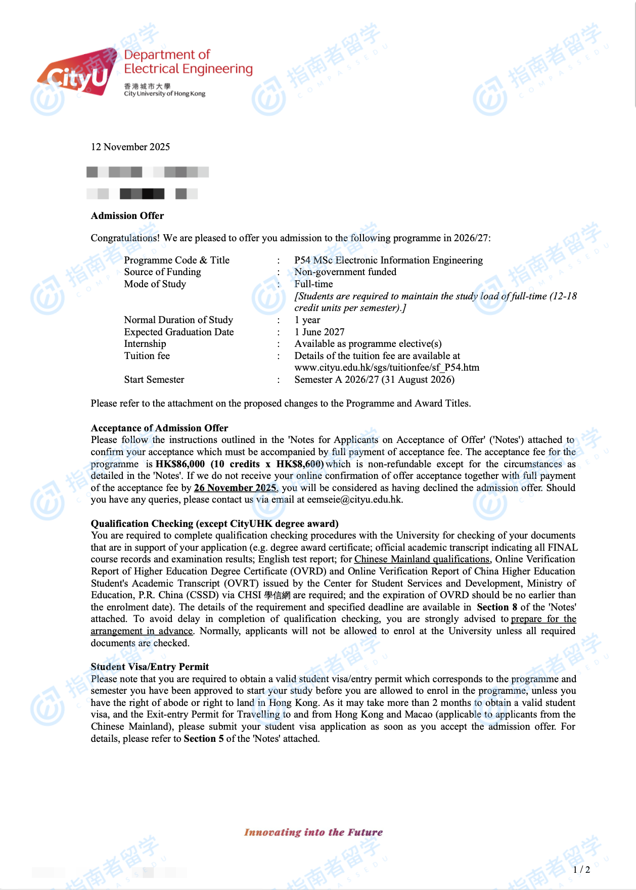 香港城市大學電子資訊工程學理學碩士研究生offer一枚