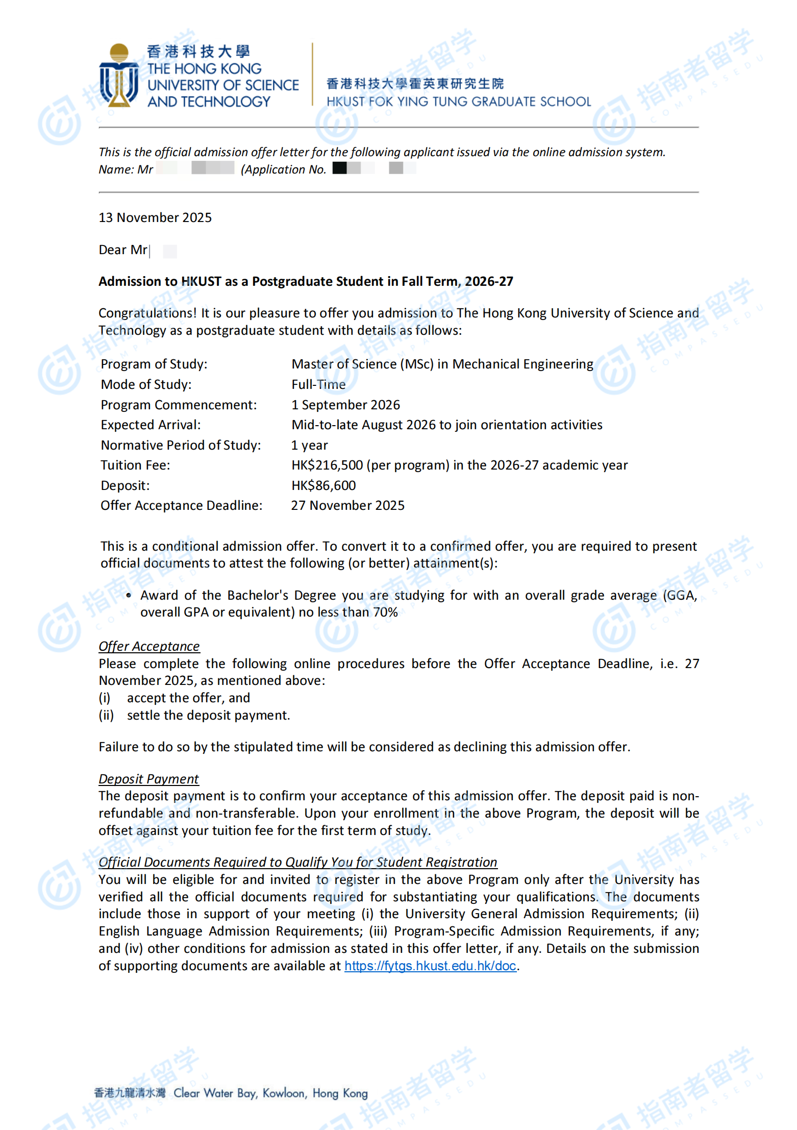 香港科技大學機械工程理學碩士研究生offer一枚