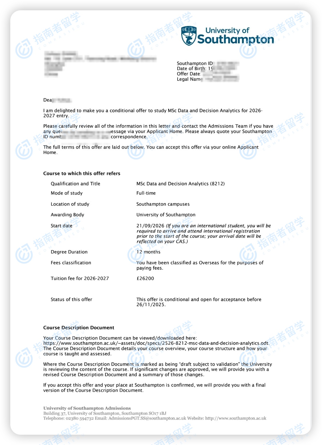 南安普頓大學數(shù)據(jù)與決策分析理學碩士研究生offer一枚
