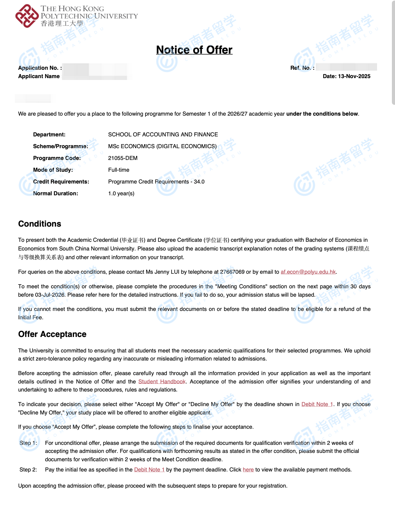 香港理工大學經(jīng)濟學理學碩士(數(shù)字經(jīng)濟學)研究生offer一枚