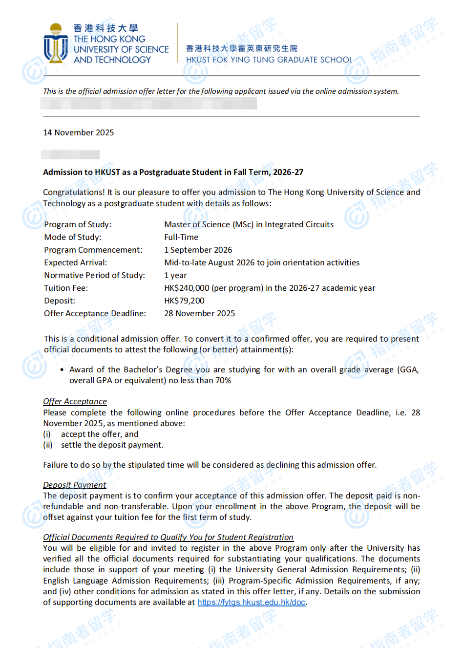 香港科技大學(xué)集成電路理學(xué)碩士研究生offer一枚