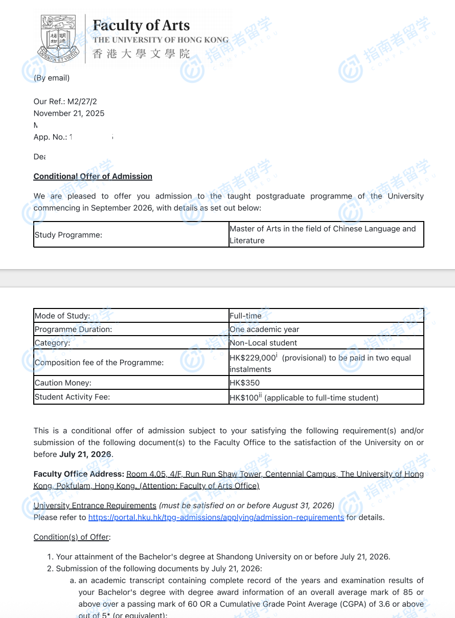 香港大學(xué)中國語言文學(xué)文學(xué)碩士研究生offer一枚