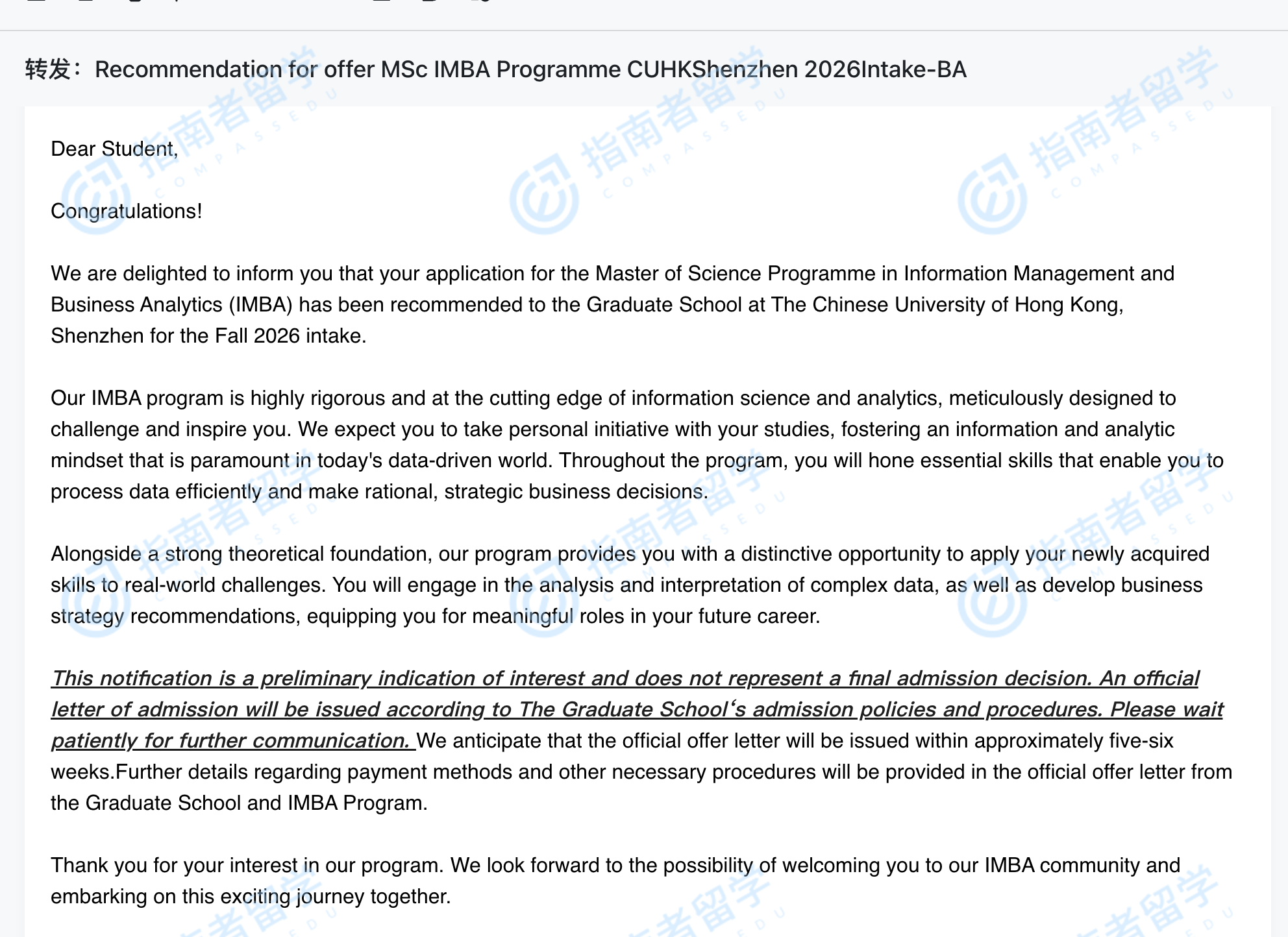 香港中文大學信息管理 & 商業(yè)分析理學碩士(CUHK-Shenzhen)研究生offer一枚