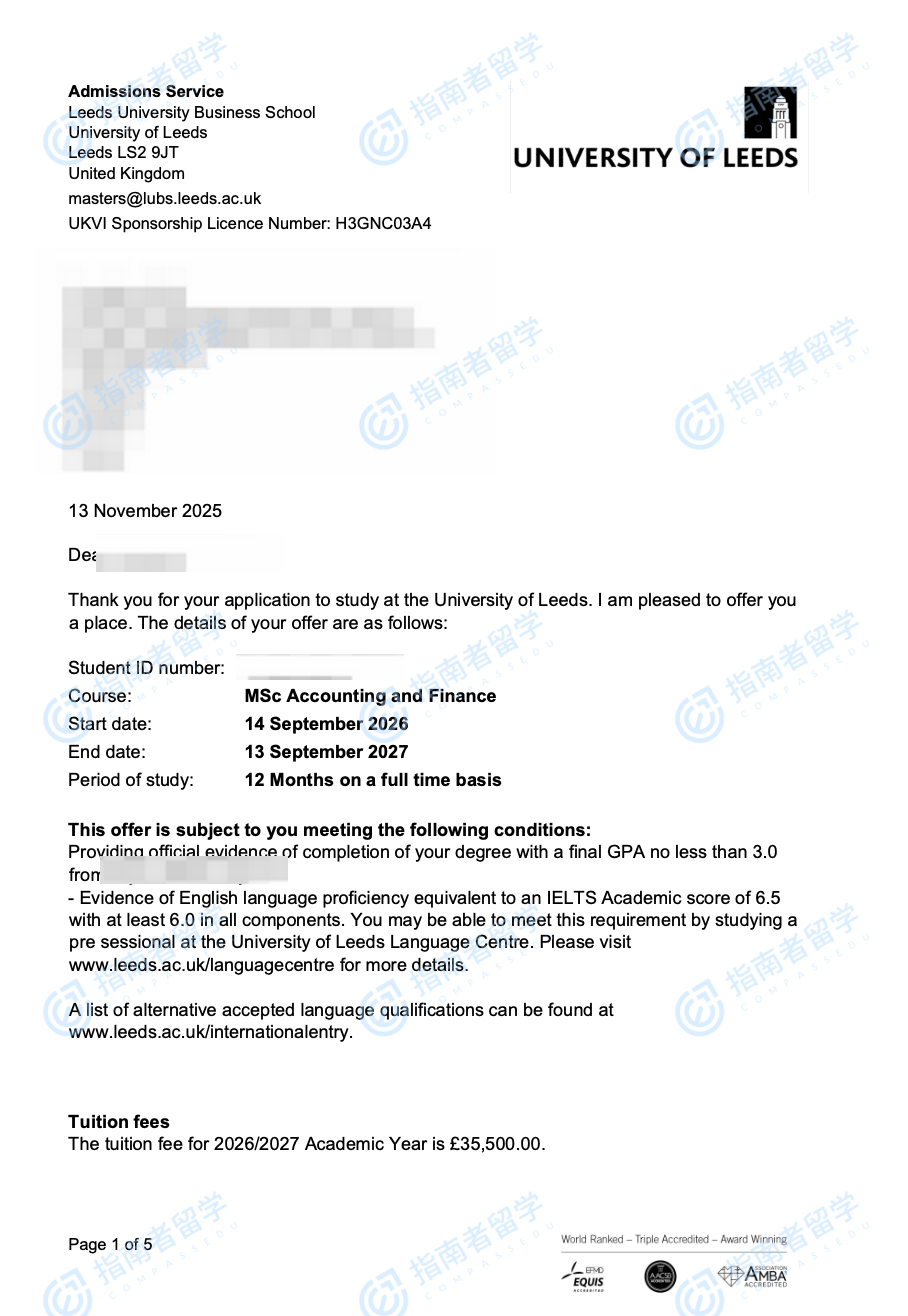 利茲大學會計與金融理學碩士研究生offer一枚
