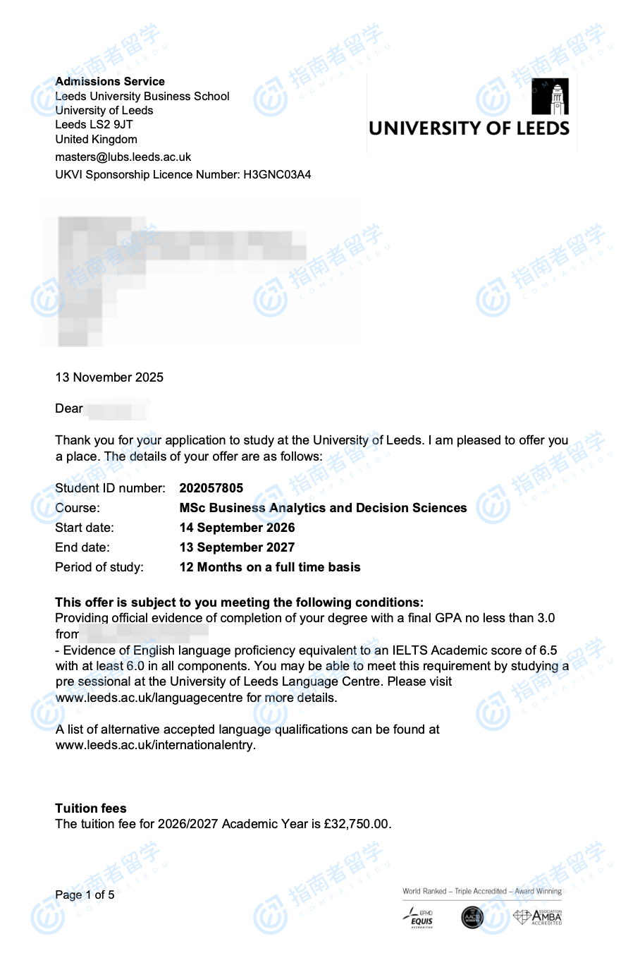 利茲大學(xué)商業(yè)分析與決策科學(xué)理學(xué)碩士研究生offer一枚