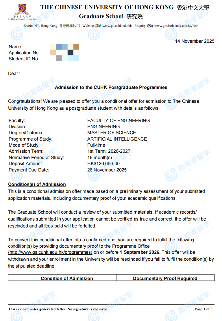 香港中文大學(xué)人工智能理學(xué)碩士研究生offer一枚