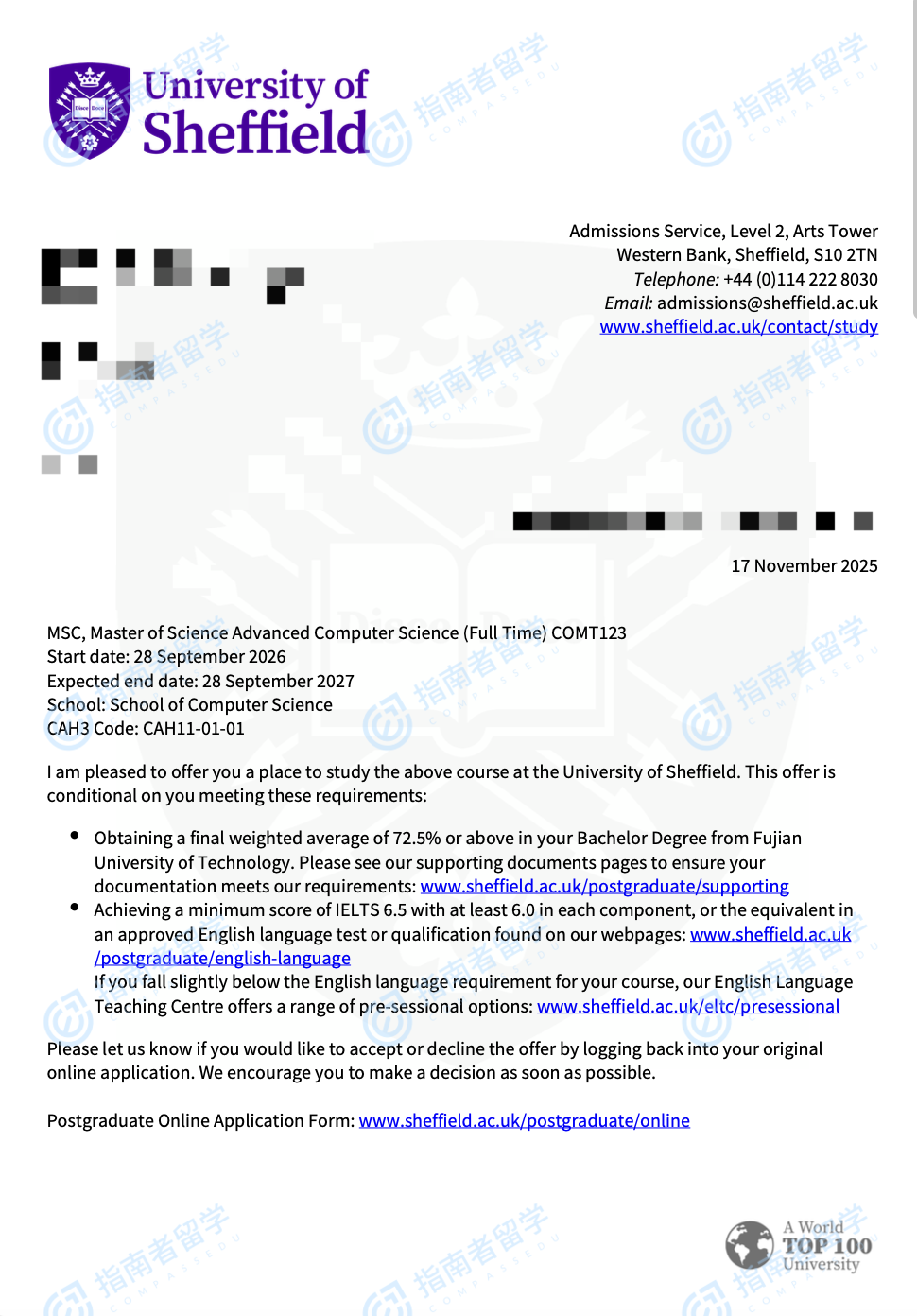 謝菲爾德大學(xué)高級計算機科學(xué)理學(xué)碩士研究生offer一枚