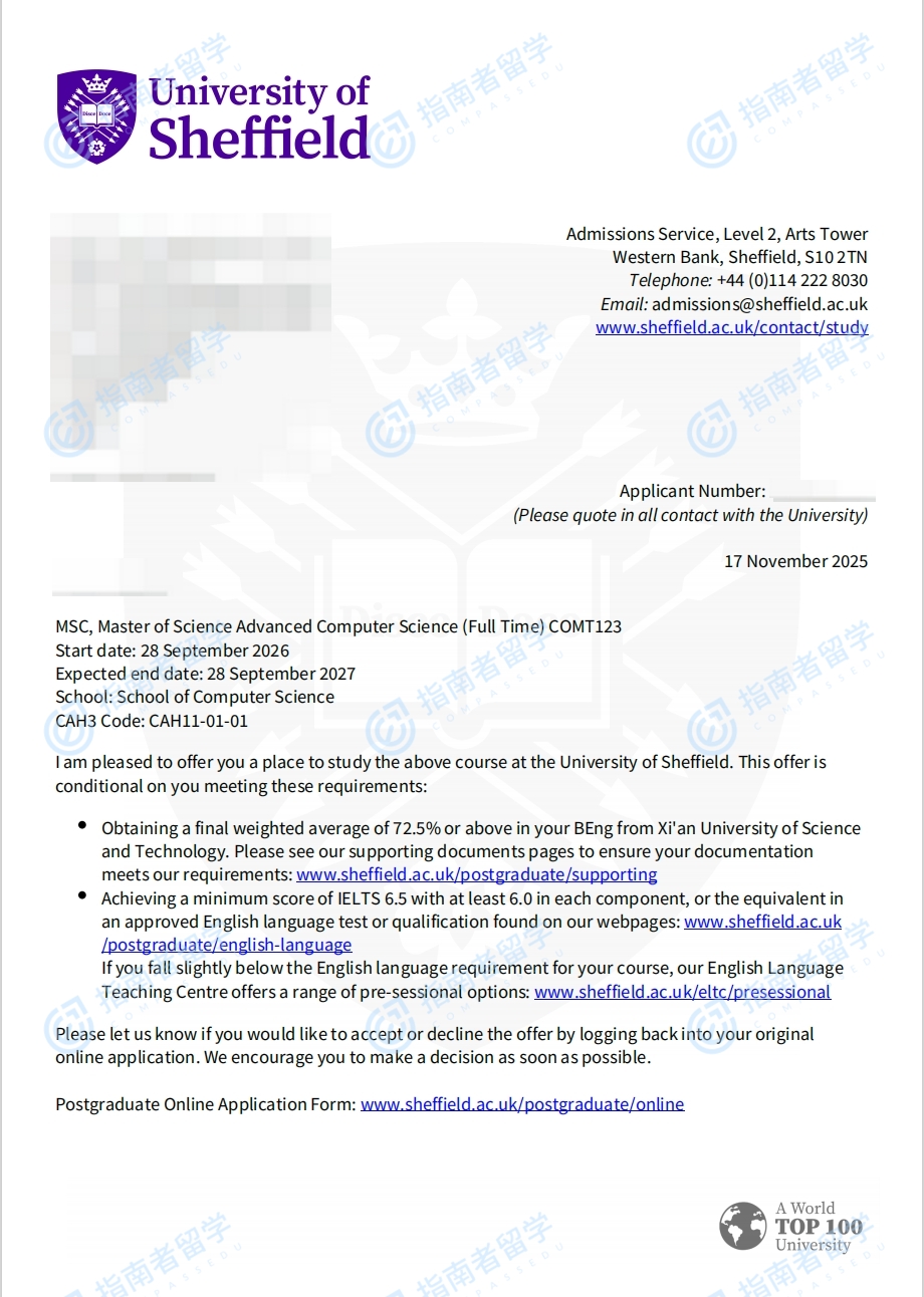謝菲爾德大學高級計算機科學理學碩士研究生offer一枚