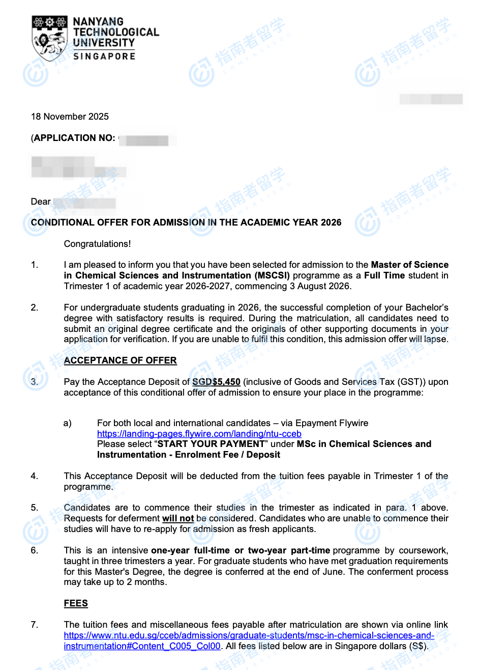 南洋理工大學(xué)化學(xué)科學(xué)與儀器理學(xué)碩士研究生offer一枚
