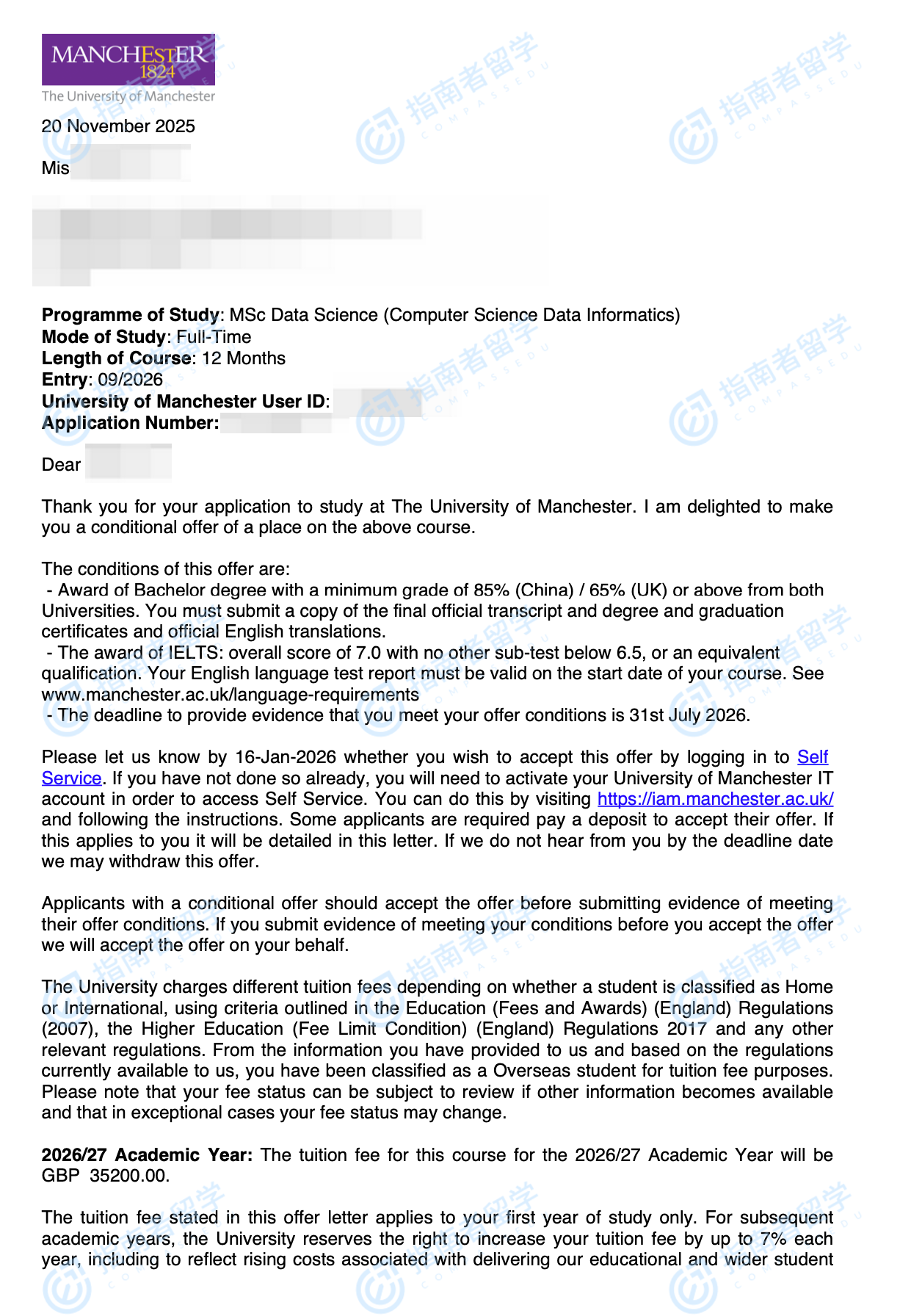 曼徹斯特大學(xué)數(shù)據(jù)科學(xué)(商業(yè)與管理)理學(xué)碩士研究生offer一枚